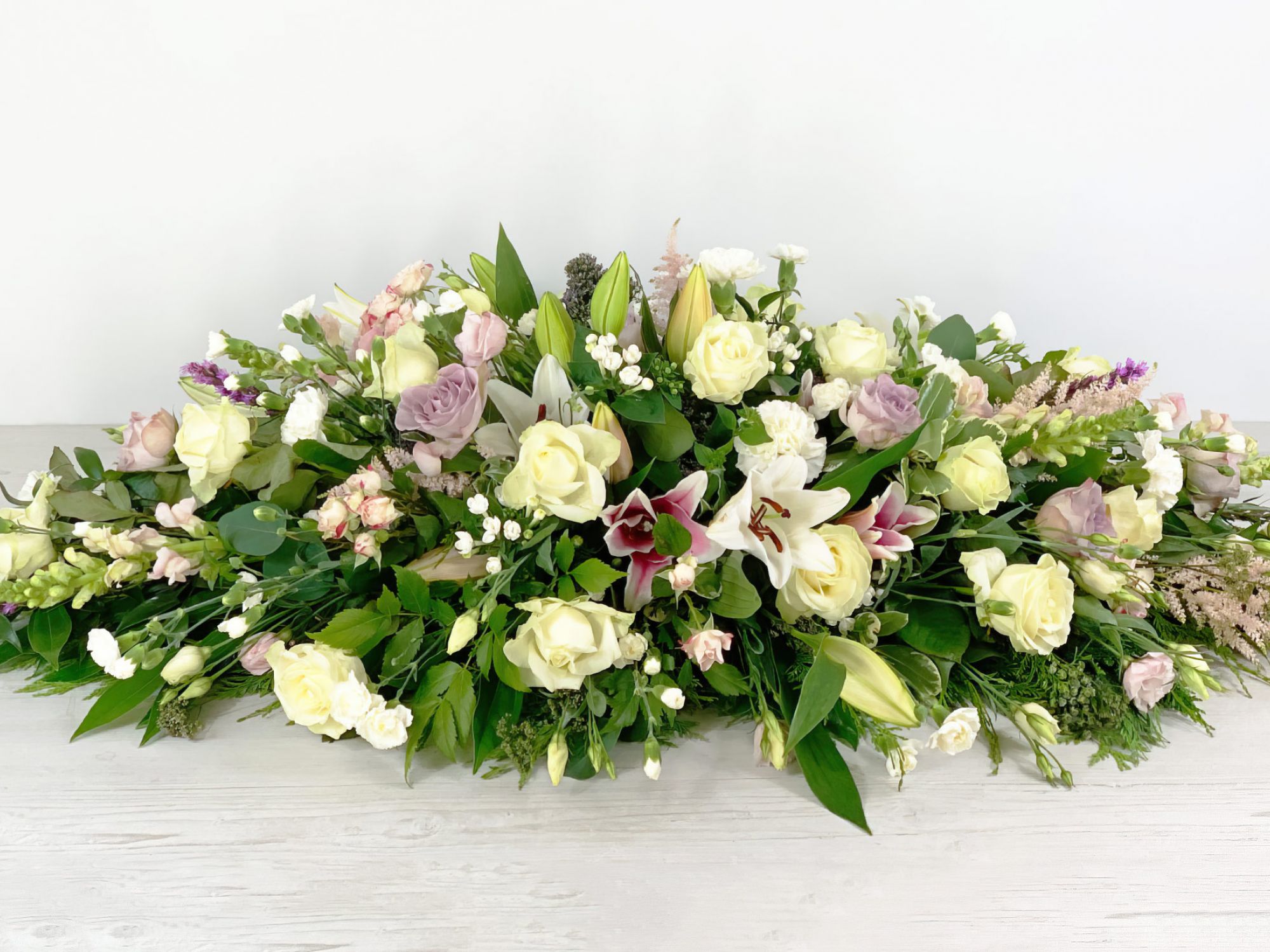 Ref: DE103ft: £1754ft: £2105ft: £245A large coffin spray with a selection of pale pink and white fresh flowers, including roses. This tribute can be made in a variety of sizes starting at 3ft in length. All fresh flowers and foliage are subject to seasonal availability.