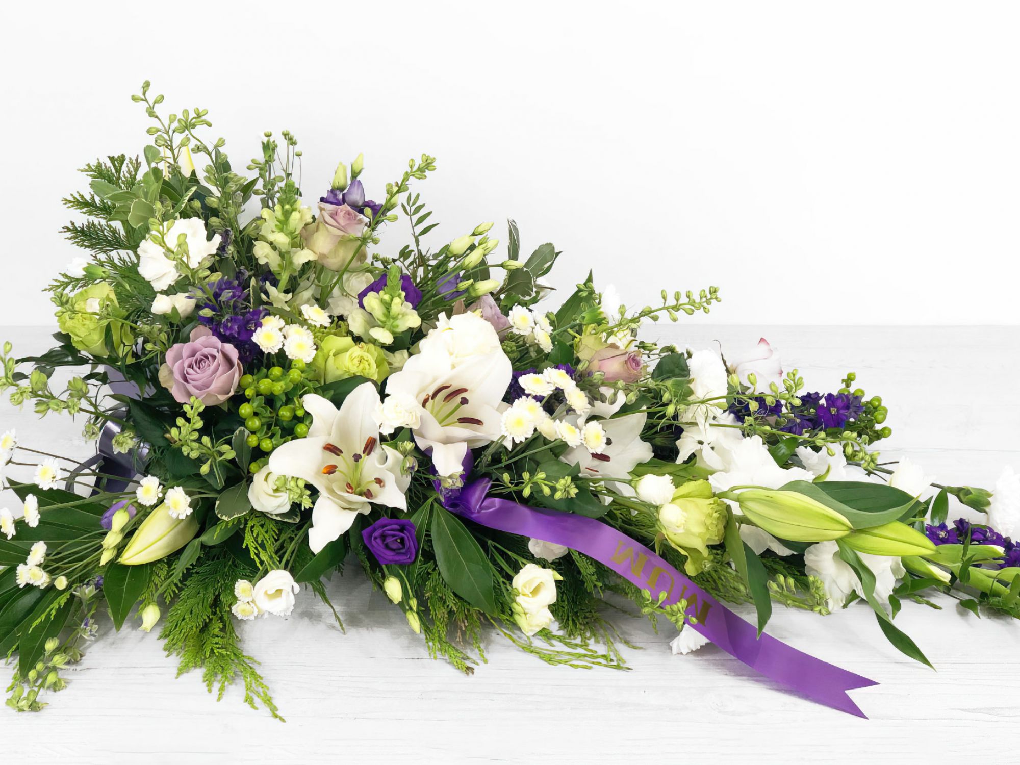 Ref: DE143ft: £1504ft: £1855ft: £225A large coffin spray with a selection of white and purple fresh flowers. This display includes cream roses, purple lisianthus, white gerbera, bepleurum and mixed foliage. This tribute can be made in a variety of sizes starting at 3ft in length.
